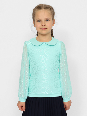 Джемпер с длинным втачным рукавом и манжетами. Манжеты, воротник и пояс выполнены из полотна с добавлением эластана. В горловине расположена эмитация рубашки с отложным воротником и стойкой.